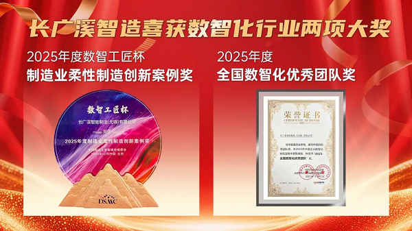 近日,长广溪智造“5G+机器人智造机器人”柔性制造产线凭借卓越的技术创新与实践成效,一举斩获“2025年度制造业柔性制造创新案例奖”、“2025全国数智化优秀团队奖”两项重磅大奖!